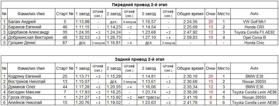 Как и в переднем приводе, всё решалось в последнем заезде. Евгений стартовал раньше и ещё раз улучшил своё время, показав результат 1 мин 14,81 сек. Николай выехал на старт последним и проехал трассу очень быстро, показав лучшее чистое время дня - 1.13,61. Но один сбитый конус не позволил ему занять первое место. С разницей 0,58 секунд победил Евгений.